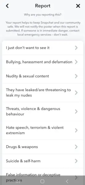 Окрім блокування та видалення інших користувачів, у Snapchat є можливість повідомити про порушення. Користувачі повинні повідомляти Snapchat про будь-який неприйнятний вміст, який вони зустрічають, переслідування чи залякування. На веб-сайті є спеціальний розділ для повідомлення про порушення/неприйнятний вміст. Для отримання додаткової інформації перейдіть до як чи повідомляти про порушення або незаконний вміст у Snapchat?