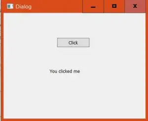 import> sys> from> PyQt5> import> QtCore, QtGui, QtWidgets> class> Ui_Dialog(> object> ):> > def> setupUi(> self> , Dialog):> > Dialog.setObjectName('Dialog')> > Dialog.resize(> 400> ,> 300> )> > self> .pushButton> => QtWidgets.QPushButton(Dialog)> > self> .pushButton.setGeometry(QtCore.QRect(> 150> ,> 70> ,> 93> ,> 28> ))> > self> .label> => QtWidgets.QLabel(Dialog)> > self> .label.setGeometry(QtCore.QRect(> 130> ,> 149> ,> 151> ,> 31> ))> > self> .label.setText('')> > self> .retranslateUi(Dialog)> > QtCore.QMetaObject.connectSlotsByName(Dialog)> > > # adding signal and slot> > self> .pushButton.clicked.connect(> self> .showmsg)> > def> retranslateUi(> self> , Dialog):> > _translate> => QtCore.QCoreApplication.translate> > Dialog.setWindowTitle(_translate('Dialog', 'Dialog'))> > self> .pushButton.setText(_translate('Dialog', 'Click'))> > > def> showmsg(> self> ):> > # slot> > self> .label.setText('You clicked me')> if> __name__> => => '__main__':> > app> => QtWidgets.QApplication(sys.argv)> > MainWindow> => QtWidgets.QMainWindow()> > ui> => Ui_Dialog()> > ui.setupUi(MainWindow)> > MainWindow.show()> > sys.exit(app.exec_())> |